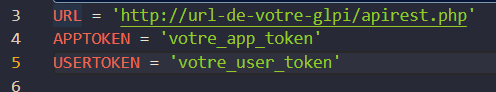 • fonctions_injection.py : Contient les fonctions servant à injecter des données dans GLPI. Il est nécessaire de modifier les 3 lignes suivantes par les données de votre installation GLPI.