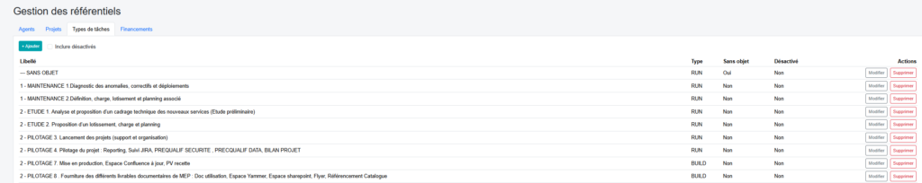 Onglet de gestion des types de tâches